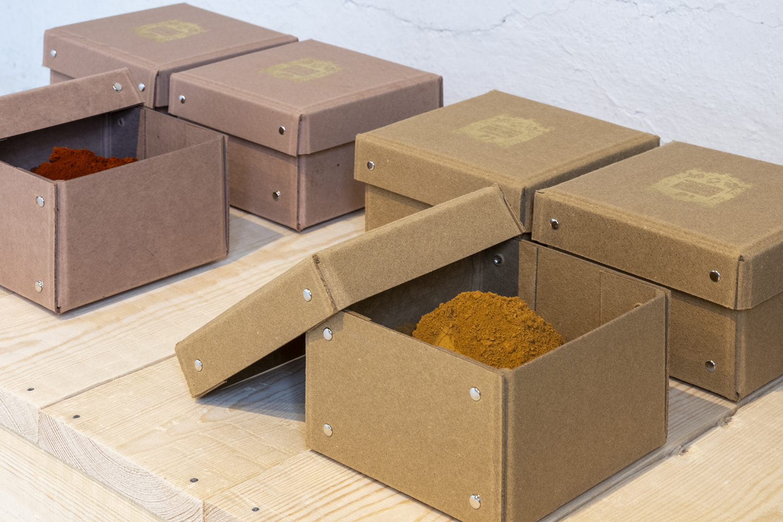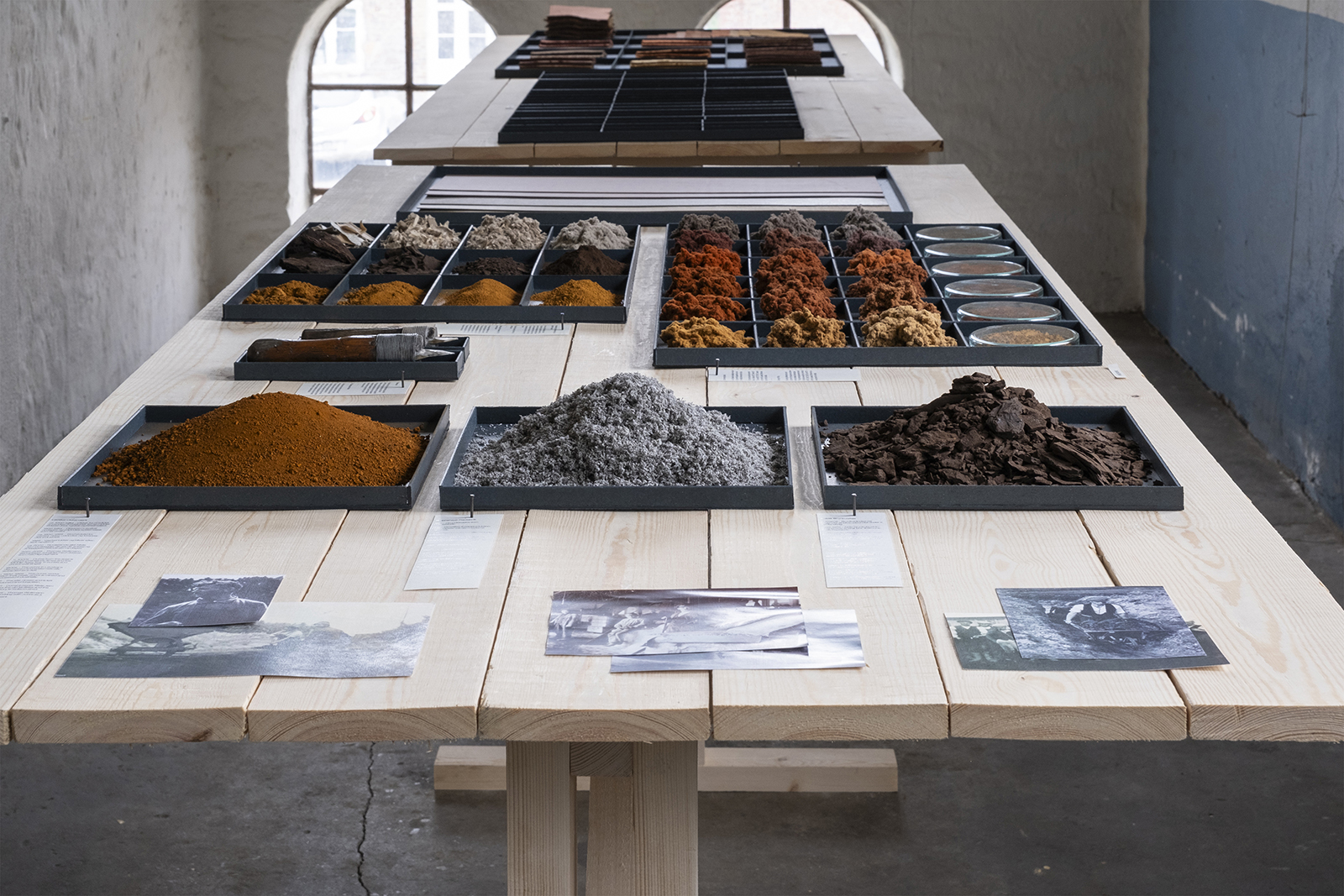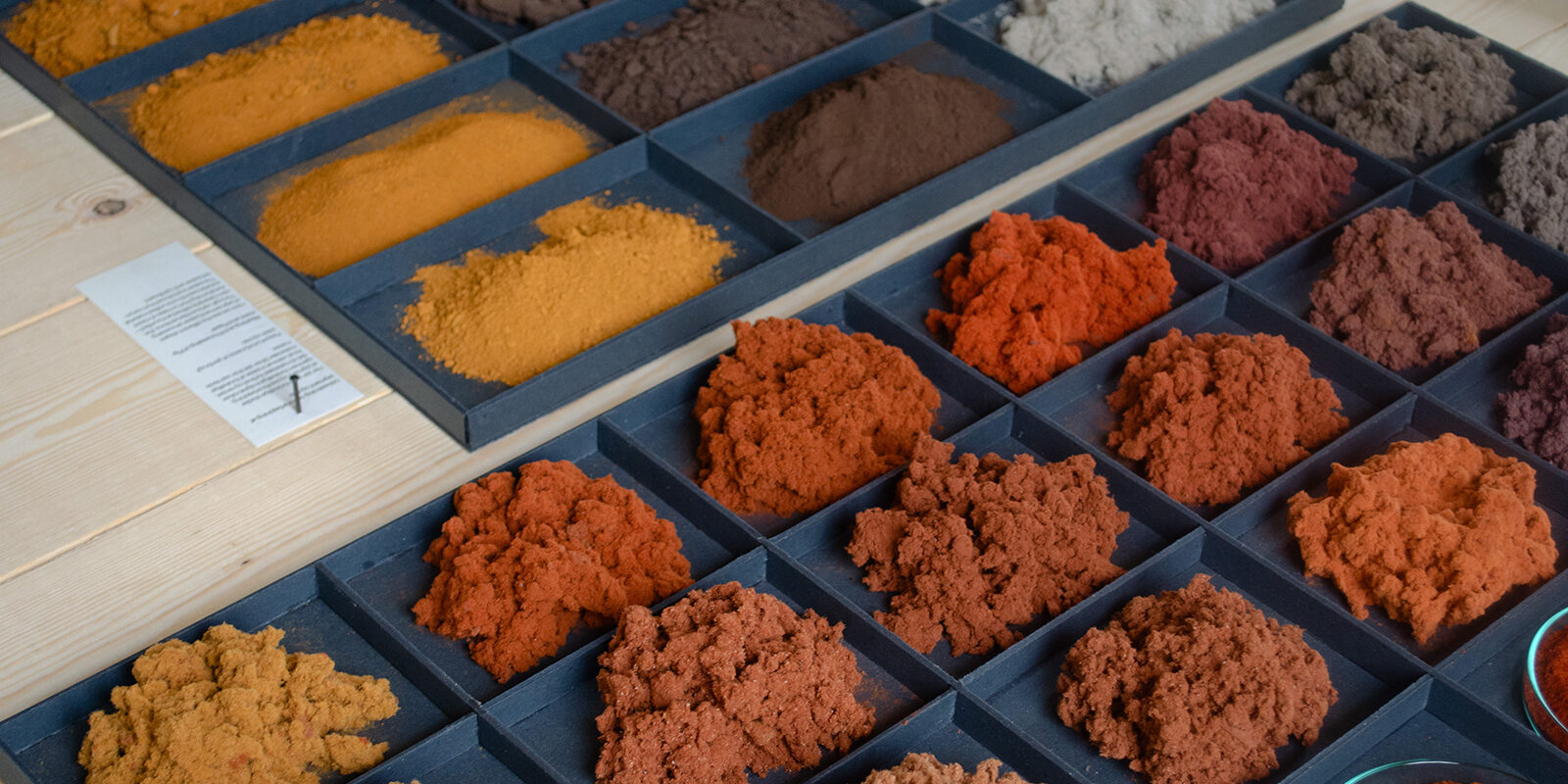 Fra jord til jord’ er en udstilling og en undersøgelse af tre industrier – deres historie, deres håndværk og deres sammenfletning. Gennem eksperimentel indfarvning af pap har Thomas Woltmann udforsket livscyklusser og materialer fra en 100 år gammel papfabrik, et lukket okkerværk og en forladt brunkulsmine.