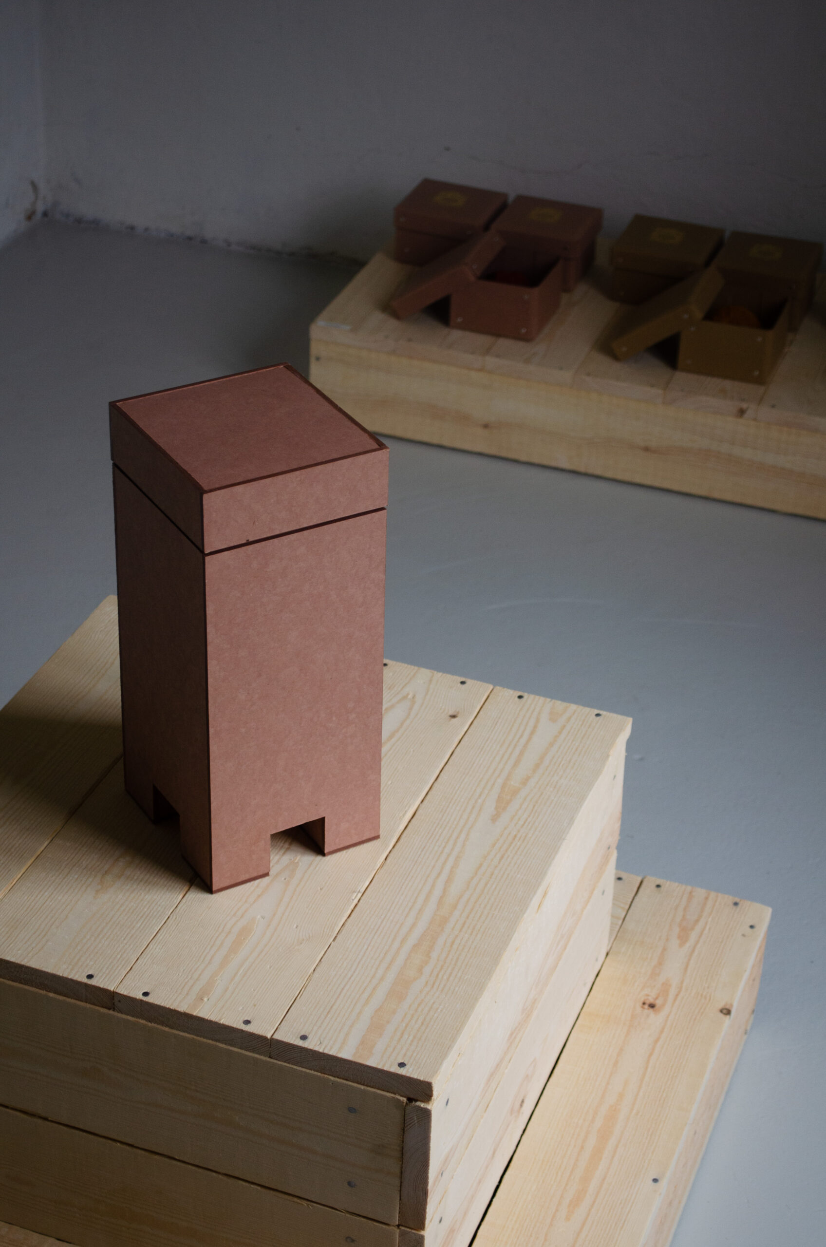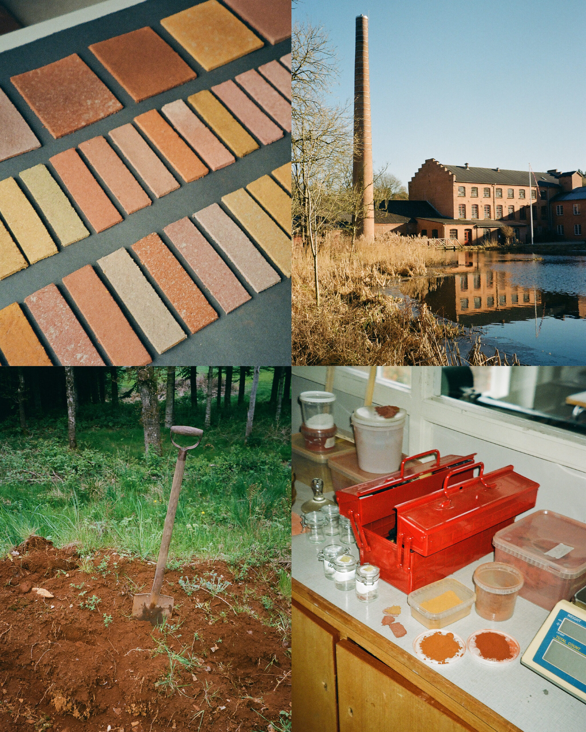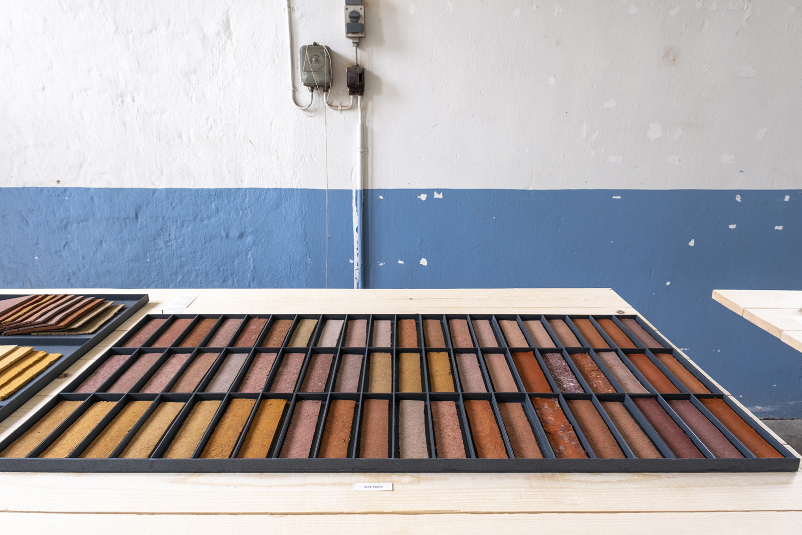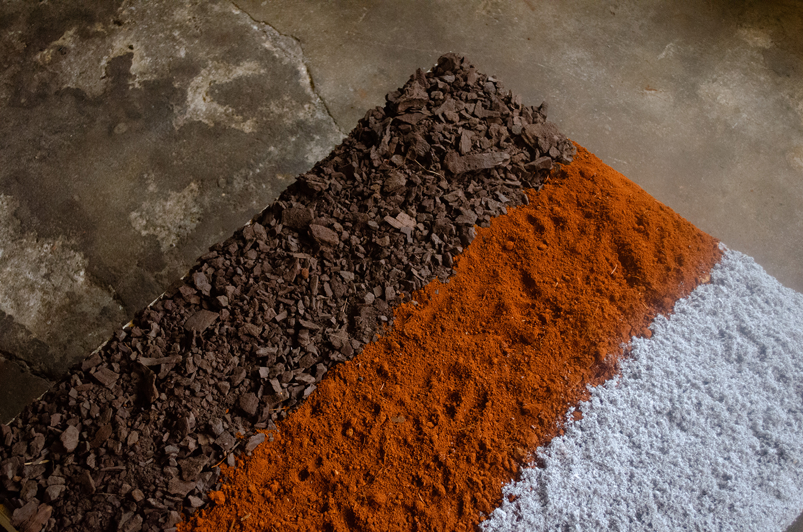 Fra jord til jord’ er en udstilling og en undersøgelse af tre industrier – deres historie, deres håndværk og deres sammenfletning. Gennem eksperimentel indfarvning af pap har Thomas Woltmann udforsket livscyklusser og materialer fra en 100 år gammel papfabrik, et lukket okkerværk og en forladt brunkulsmine.